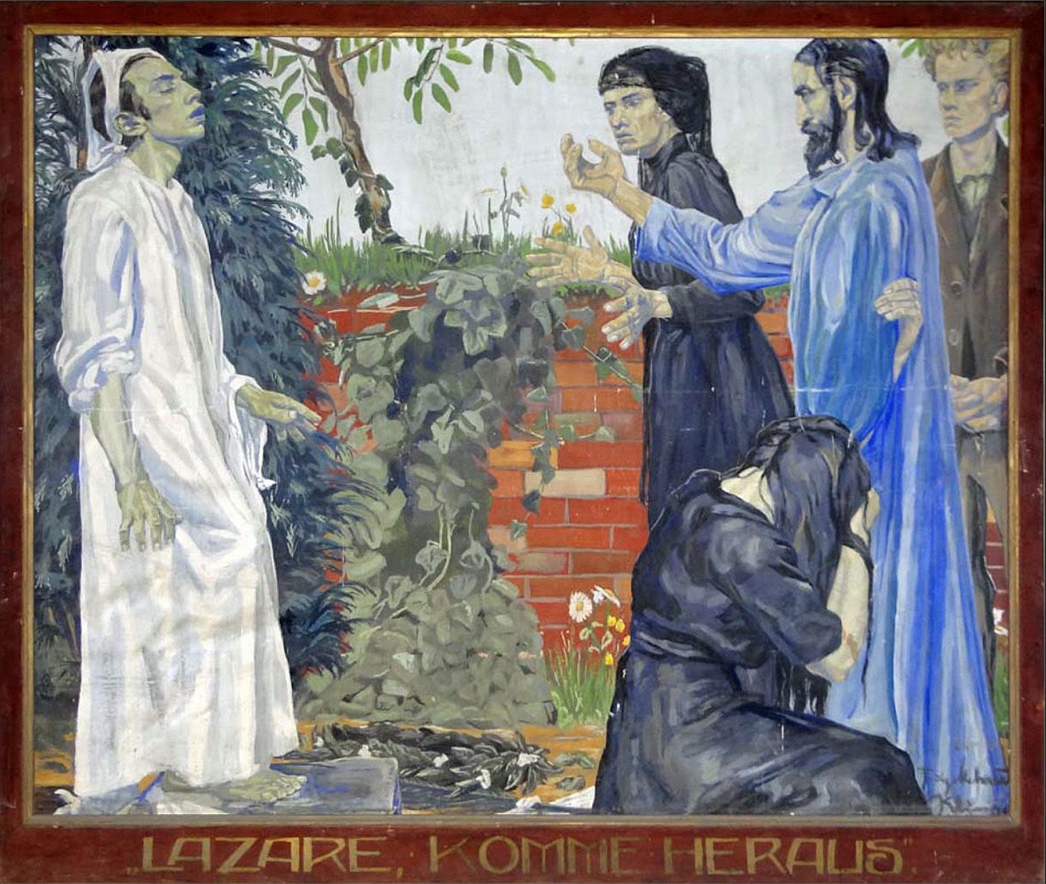 Als er das gesagt hatte, rief er mit lauter Stimme: Lazarus, komm heraus! Und der Verstorbene kam heraus, gebunden mit Grabtüchern an Füßen und Händen, und sein Gesicht war verhüllt mit einem Schweißtuch. Jesus spricht zu ihnen: Löst die Binden und laßt ihn gehen!