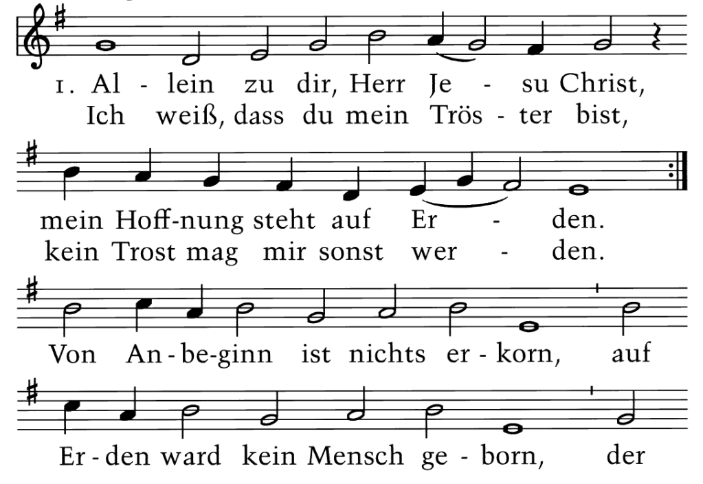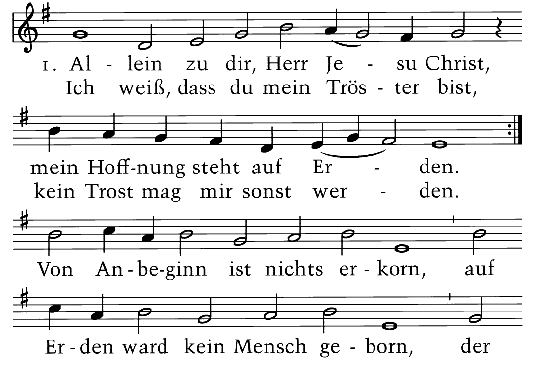 Allein zu dir, Herr Jesu Christ, mein Hoffnung steht auf Erden. Ich weiß, dass du mein Tröster bist, kein Trost mag mir sonst werden. Von Anbeginn ist nichts erkorn, auf Erden ward kein Mensch geborn, der mir aus Nöten helfen kann; ich ruf dich an, zu dem ich mein Vertrauen han.
