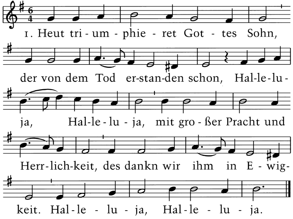 Nicht mehr als nur drei Tage lang bleibt mein Heiland ins Todes Zwang; Halleluja, Halleluja; am dritten Tag durchs Grab er dringt, mit Ehren sein Siegesfähnlein schwingt. Halleluja, Halleluja.