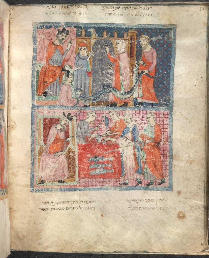 Er sandte seinen Knecht Mose und Aaron, den er erwählt hatte. Die taten seine Zeichen unter ihnen und seine Wunder im Lande Hams. Er sandte Finsternis und machte es finster; doch sie blieben ungehorsam seinen Worten. Er verwandelte ihre Wasser in Blut und tötete ihre Fische. Ihr Land wimmelte von Fröschen bis in die Kammern ihrer Könige. Er gebot, da kam Ungeziefer, Stechmücken in all ihr Gebiet. Er gab ihnen Hagel statt Regen, Feuerflammen in ihrem Lande und schlug ihre Weinstöcke und Feigenbäume und zerbrach die Bäume in ihrem Gebiet. Er gebot, da kamen Heuschrecken und Käfer ohne Zahl; sie fraßen alles Gras in ihrem Lande, und fraßen auch die Frucht ihres Ackers. Er schlug alle Erstgeburt in Ägypten, alle Erstlinge ihrer Kraft.